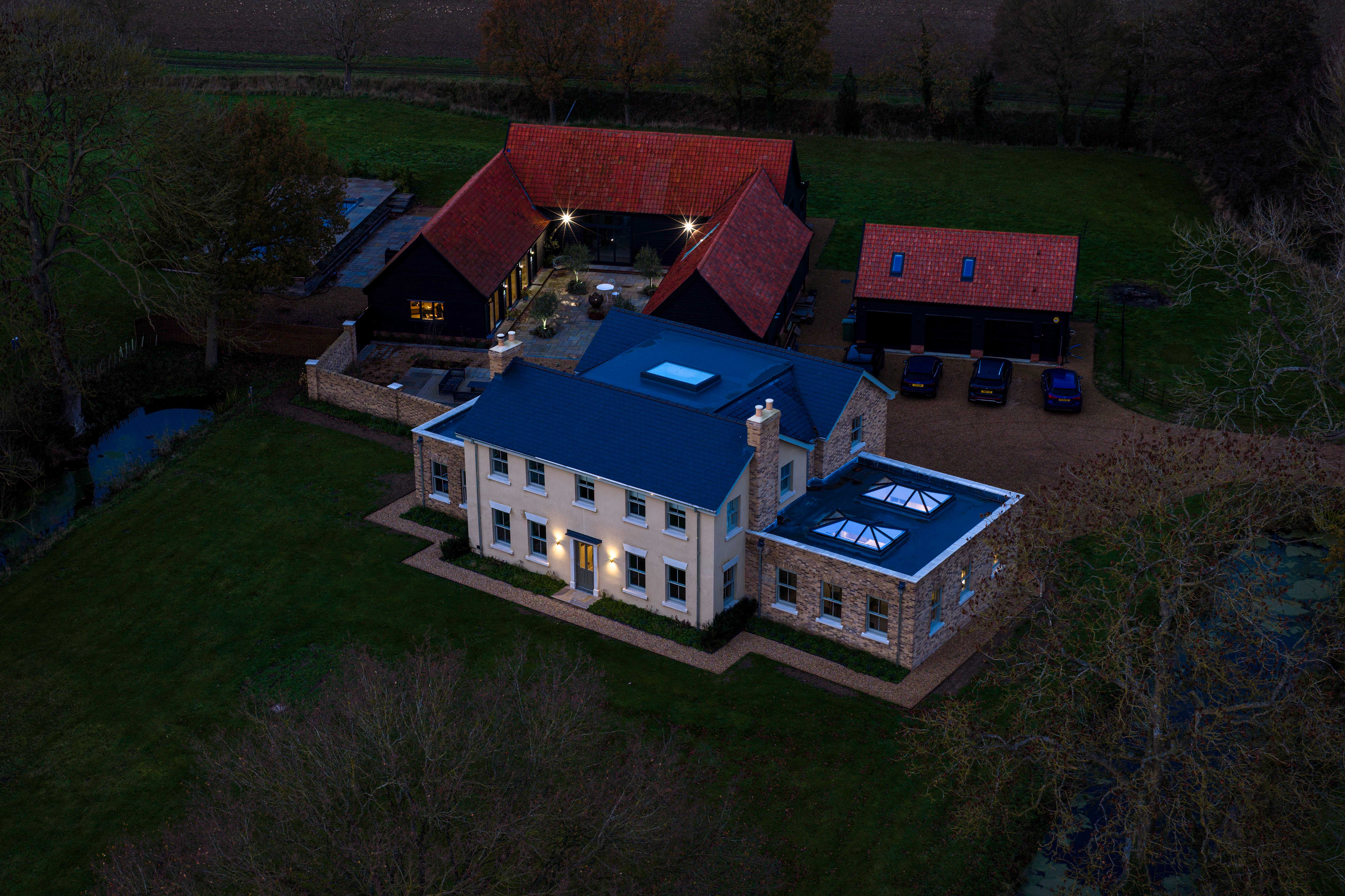 The project in Diss successfully transformed an old, neglected estate into a stunning modern residence. The newly built 4,000 square foot home, the refurbished barns, and the additional cart lodge and garage now provide the client with a luxurious and functional living environment that still retains the charm of the original site. The client was extremely pleased with the end result, particularly the bespoke approach that allowed them to achieve their ideal vision for the property.